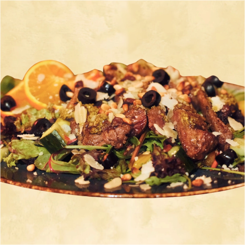 Gegrilde en gesneden ossenhaas met rucola, parmezaanse kaas en balsamico creme
